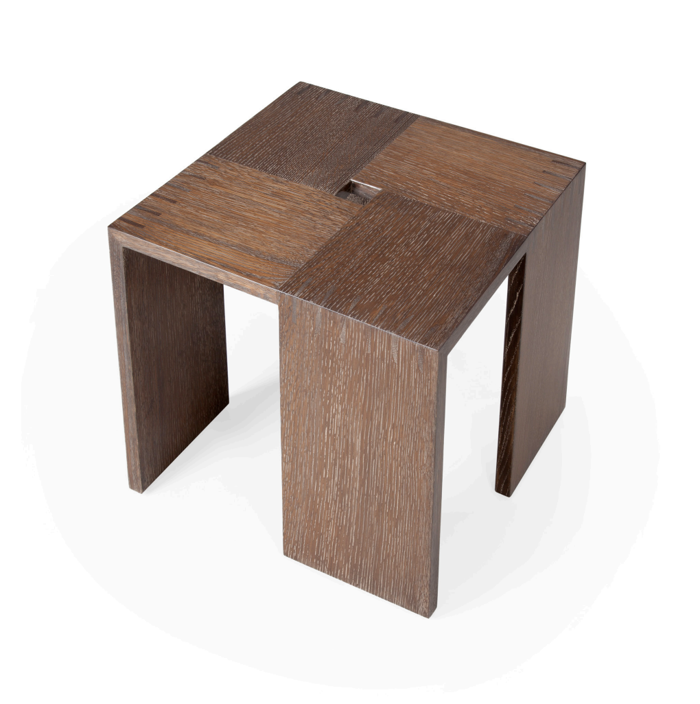 Solid wood. Available in Rift Oak (shown), Quartered Walnut, and in Teak for outdoor use.