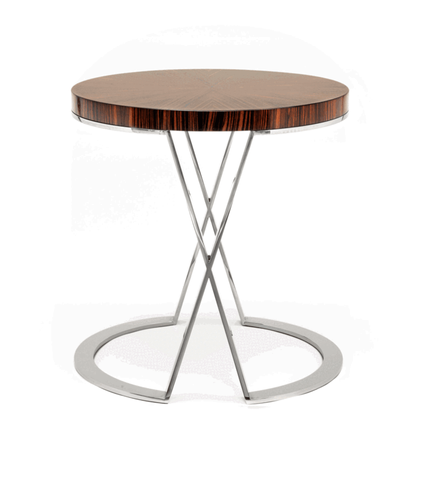 Polished stainless steel base with Macassar Ebony starburst top (shown). Statuary bronze base with Rift Oak starburst top. Small: 20 1/2” Dia. x 21”H (shown) Large: 22 5/8” Dia. x 23”H