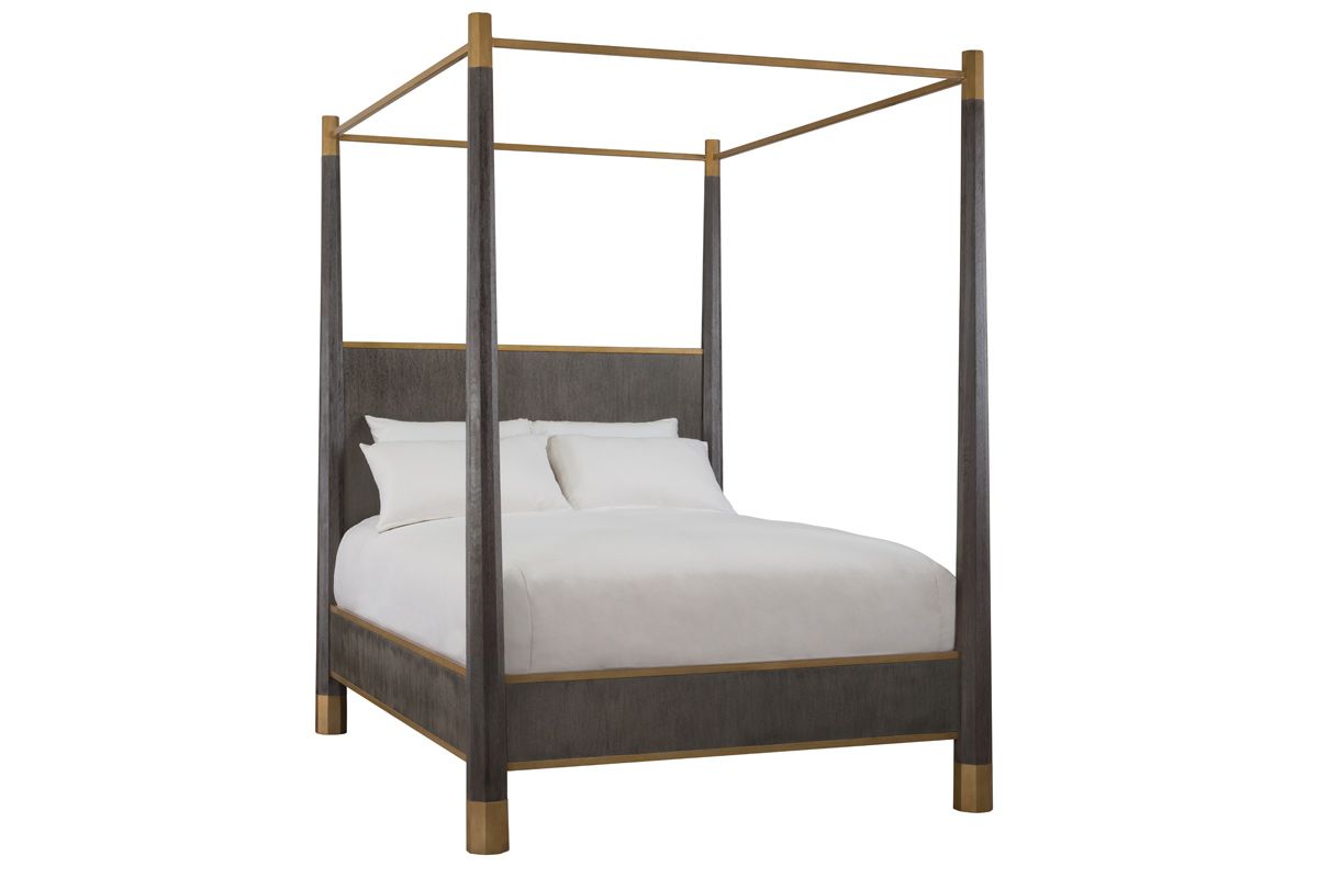 Solid wood headboard with tapered, octagonal posts. Iron canopy and iron caps on bottom of post. Headboard, footboard and side rails have iron trim on top and bottom. Bed slats are provided. Shown in Cobalt Wire Brushed on Walnut with Aged Brass details.