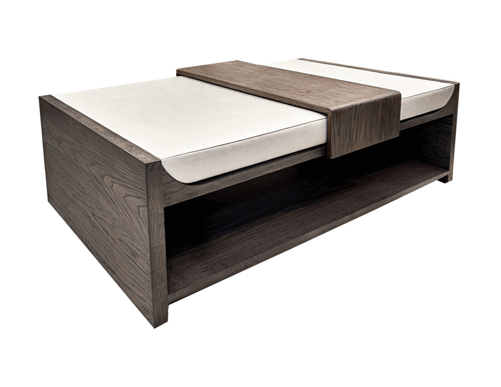 3 yards of COM required. Why surrender contemporary elegance for functionality? Softly upholstered in leather, the 767 COCKTAIL OTTOMAN features extra seating for your next gathering while still providing a solid sliding table surface for an ample supply of liquid refreshments. Additionally, the shelf below provides sufficient storage space for your favorite coffee table books or even a quick hideaway for centralized clutter.