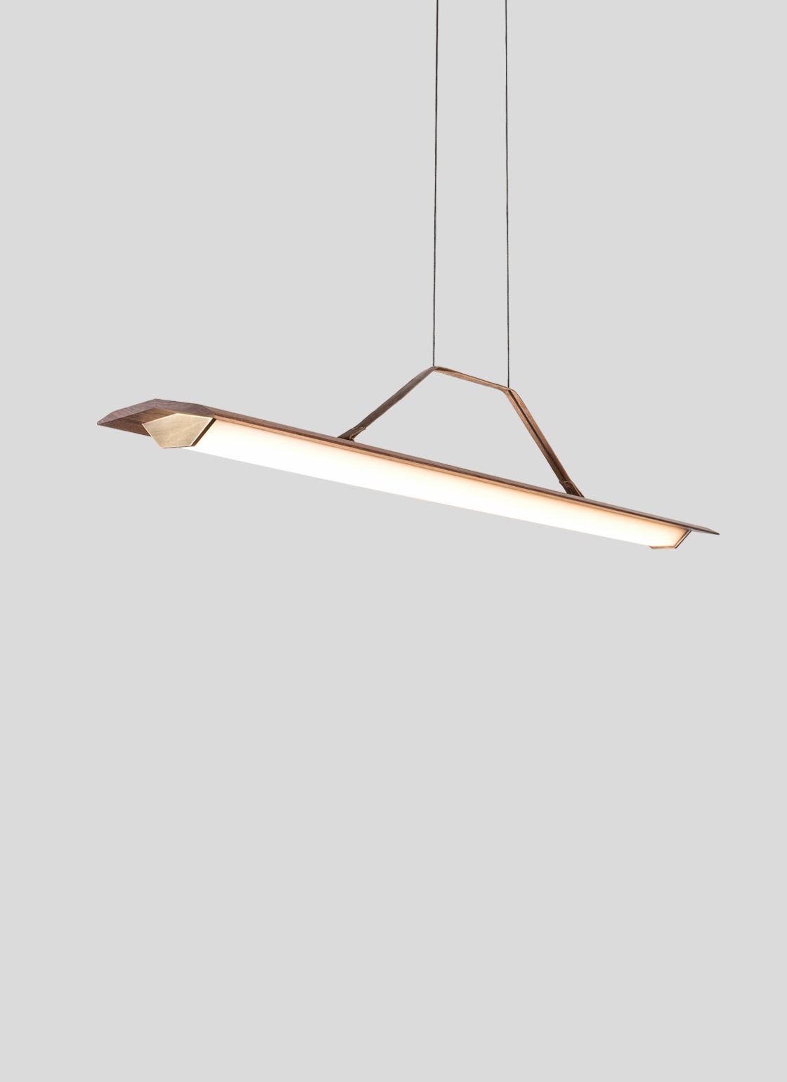 Penna 40 Dimensions: 40.5" x 7.7" , 2.3" Materials: solid wood, polymer, brass, leather Product weight: 7 lb Light source: integrated LED Light output - total: 1530 Lumens (source) Light color*: 2700 K or 3500 K Color accuracy: 90+ CRI Power usage: 21 W Dimmable (see driver below) Linear canopy included Canopy dimensions: 11.9" x 4.4", 1.7" Canopy finish: black (CM-049) See website for more canopy information 8'-0" drop length, field adjustable Suitable for a sloped ceiling Wood grain will vary Penna 64 Dimensions: 64.5" x 7.7" , 2.3" Materials: solid wood, polymer, brass, leather Product weight: 10 lb Light source: integrated LED Light output - total: 2550 Lumens (source) Light color*: 2700 K or 3500 K Color accuracy: 90+ CRI Power usage: 35 W Dimmable (see driver below) Linear canopy included Canopy dimensions: 11.9" x 4.4", 1.7" Canopy finish: black (CM-049) See website for more canopy information 8'-0" drop length, field adjustable Suitable for a sloped ceiling Wood grain will vary