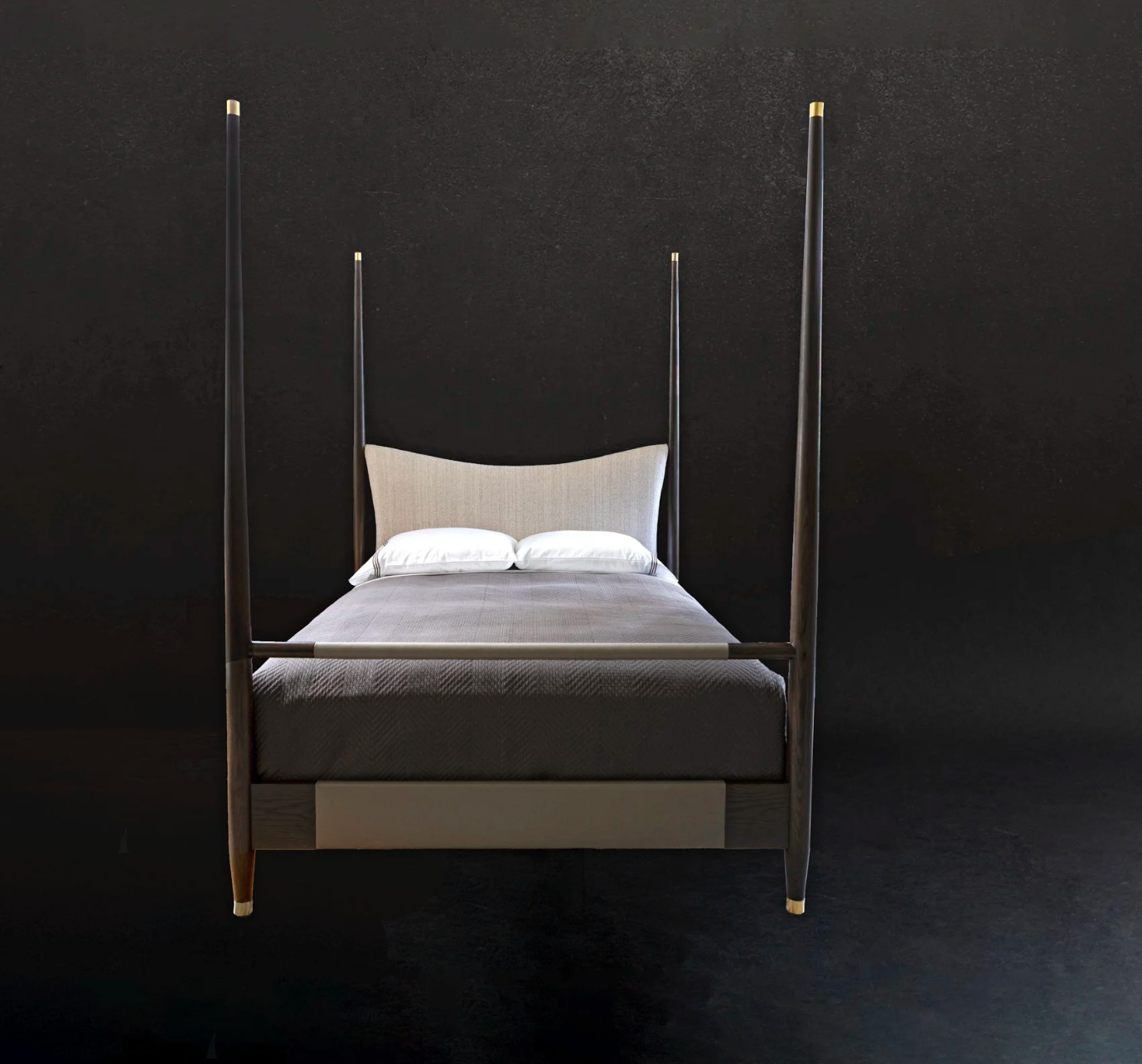 Made of premium materials, including solid white oak and walnut wood, heirloom-quality brass ferrules and caps, high-quality leather (by-product), and sustainable Belgian linen. Every detail has been thought of from the overstuffed yet graceful, pillow-like headboard to the padded leather wrapping the sides and foot rails. Also available in COM and COL. Made to order in California by artisans and craftspeople proud to share their craft with the world. Available for queen, king, and California king size. Platform Height: 14” Headboard Height: 54” Post Height: 90”