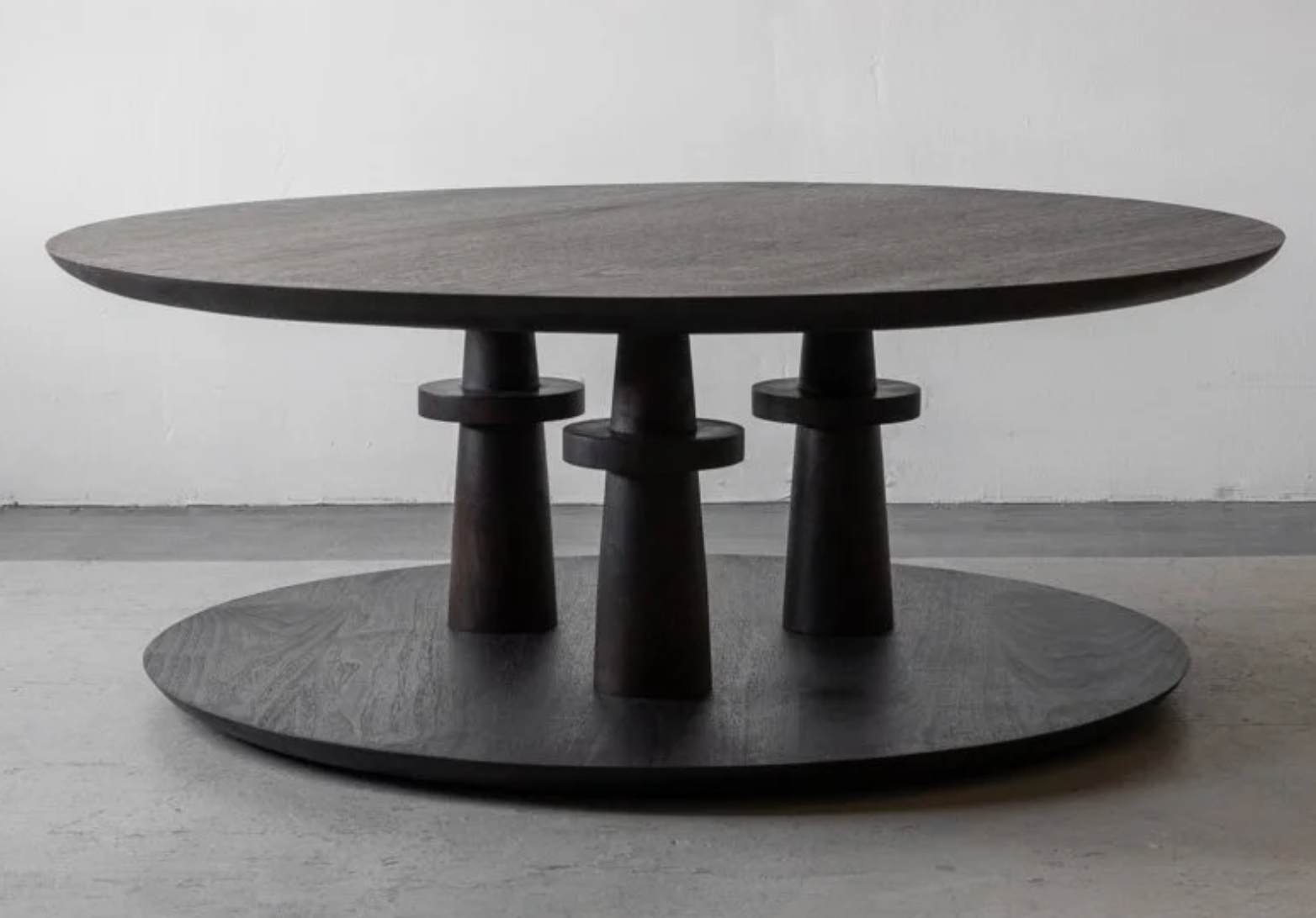The Kanu Coffee Table - simple, elegant, and sculptural. Shown in white oak - natural. Available in solid reclaimed white oak with plant based, non-toxic finishes. Made in California by skilled master craftsmen. Diameter: 42” Height: 17” Customizable