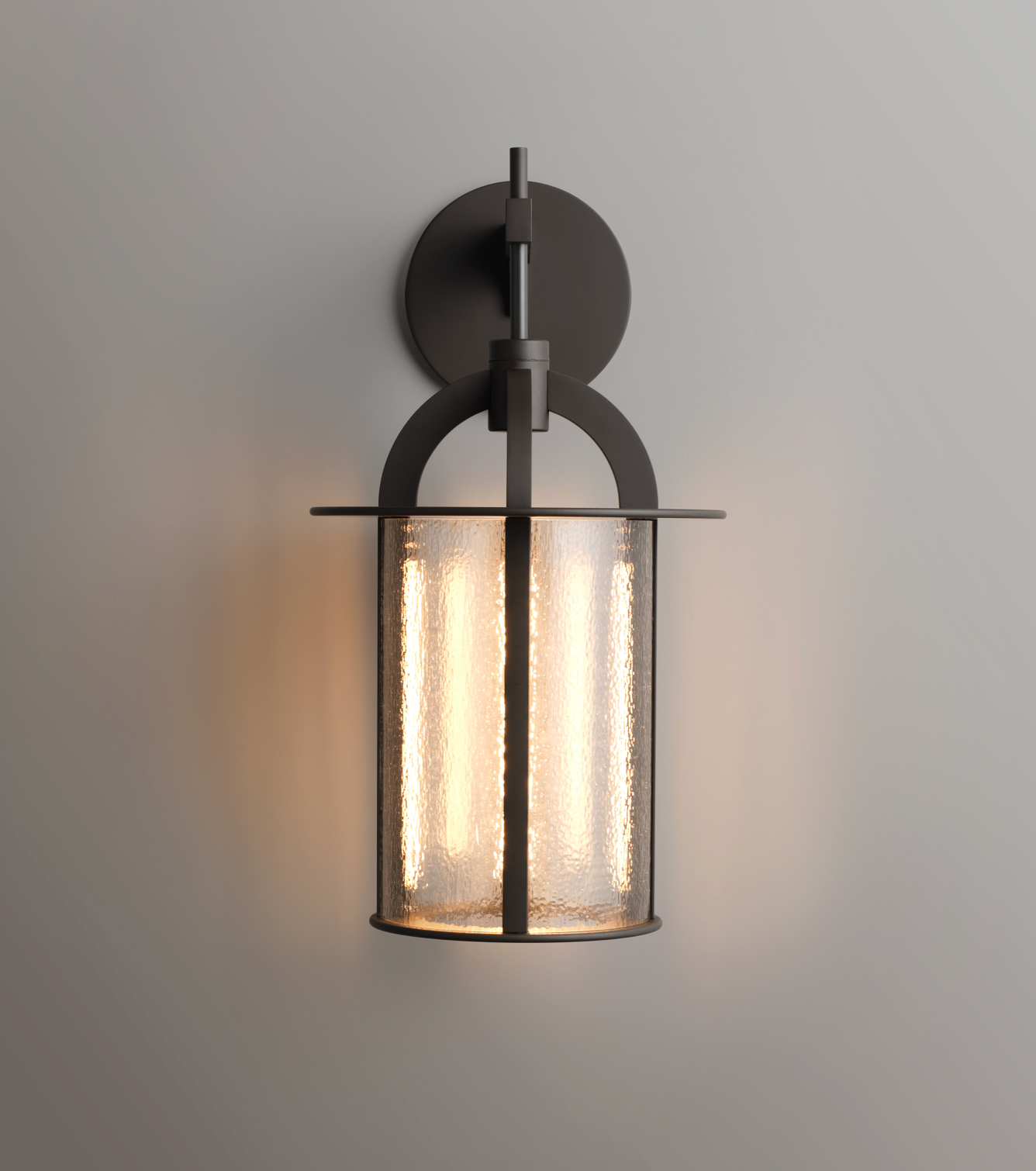 The Arcos Sconce pairs a crisp aluminum frame with a textured glass lens, available in clear or frosted. Its generous proportions and dimensional projection establish presence, while its detailing keeps it versatile in both interior and exterior applications. Designed by: Frank Neidhardt DIMENSIONS E10936 Inches - (mm) Height (Body): 16.5" (492 mm) Diameter (Body): 12" (216 mm) Projection: 10" (343mm) Net Weight: 10 lbs (4.5kg) ILLUMINATION E10933 Lightsource: LED Performance: 13 watts ~850 fixture lumens. Universal 120v-277v Color Temperature: 3000 K 90+ CRI DRIVER NEEDED 2700K color temperature is available. Lamp included with fixture. The lamps standard in this fixture can be dimmed with 0-10v, ELV or MLV style dimmers.